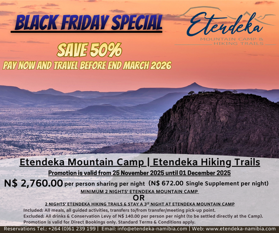 - Minimum 2 nights' stay at Etendeka Mountain Camp OR 2 nights' Etendeka Hiking Trails & 3rd night stay at Etendeka Mountain Camp (Etendeka Hiking Trails on request only)